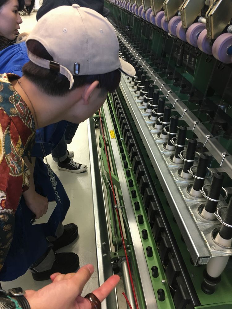 その後は工場内に入り、繊維の塊から一本の糸となるまでの製造過程(梳毛、紡毛)を見学。